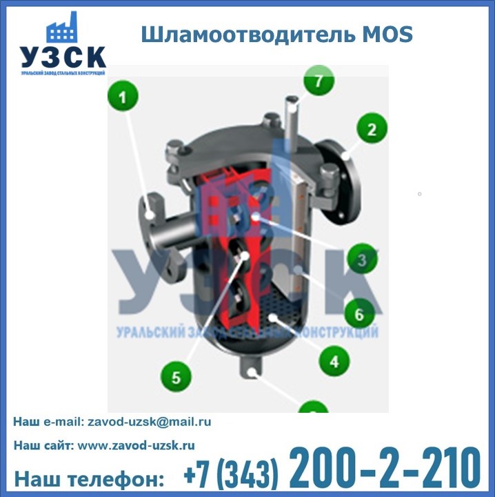 Шламоотводитель MOS состоит из цилиндрического корпуса с входным (на рис. под цифрой 1) и выходным патрубками (2), вкладышем с направляющими перегородками (3), съемным дырчатым листом (4), плоскими магнитами на перегородочных стенках (5), фильтрационной сеткой, жестко соединенной с направляющей перегородкой (6) и сетчатым фильтром (7). Некоторые элементы агрегата выпускаются съемными. А именно, таким свойством обладают крышка корпуса, перегородки с фильтрационной сеткой, а также сетчатый фильтр. За счет такого устройства удается упростить обслуживание и очистку агрегата, замену деталей и расходников, демонтаж оборудования. На цилиндрическом корпусе МШО MOS, в верхней его части, установлены входной и выходной патрубки. Вкладыш с перегородками размещен нижними кромками на съемном дырчатом листе, под которым находится шламовый сборник. С помощью перегородок задаются направление и скорость потока очищаемой среды. Данные элементы оборудованы магнитами и фильтрационной сеткой, размещенной по всей поверхности внутренней полости корпуса. Сетка предотвращает проникновение загрязнений в выходной патрубок.
